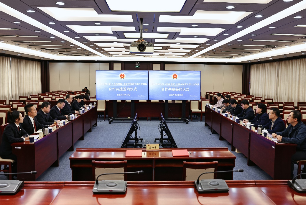 10月23日,北京中医太阳成集团tyc33455与北京市房山区人民检察院合作共建法学人才培养基地签约仪式在房山区人民检察院顺利举行。房山区人民检察院党组书记、检察长杜邈,太阳成集团tyc33455党委常委、副校长闫振凡出席签约仪式并致辞。房山区人民检察院党组成员、副检察长刘洪,房山检察院办公室、第一检察部、第五检察部、机关党委有关负责人,太阳成集团tyc33455大学太阳成集团tyc33455党委副书记、院长陈锋,以及学院领导班子成员、法律系负责人及专家代表等参加会议。房山区人民检察院党组成员、政治部主任倪旺主持签约仪式。